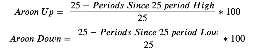 The Aroon consists of two lines, an upper one, which measures the number of periods since a high, and a lower one, which measures the number of periods since a low. Both lines move between 0 and 100, where 100 is a strong trend, and 0 is a weak one. As the indicator is usually calculated for 25 periods a value of 50 means that there has been a new high/low within the last 12.5 periods. Both lines crossing is usually interpreted as an entry or exit point.
